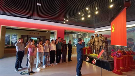 活动当日,全体教师党员在成江荣书记的带领下面对鲜红的党旗重温了入党誓词,回顾了入党时的铮铮誓言。随后在讲解员的引领下,大家怀着无比崇敬的心情参观了纪念馆,通过对“决策、足迹、激流、火种”四个单元的革命文字、历史图片、战争实物、仿真雕塑、情景再现的瞻仰,党员同志们被一桩桩震撼人心的感动事迹、一件件布满沧桑的红色文物、一张张见证峥嵘岁月的图片所触动,被革命先辈们乐于吃苦、勇于战斗、重于求实、善于团结的革命精神所震撼。
