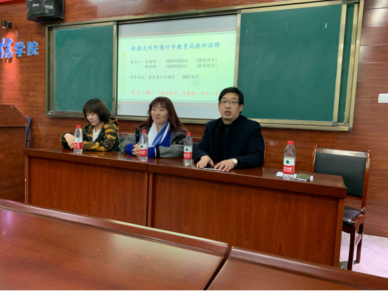 2019年3月12日晚8点,新疆克州阿图什市教育局赴陇南师专招聘宣讲会在公司科技楼608会议室进行。宣讲会上,负责招聘的老师分别就招聘原则、招聘的对象和条件以及专业需求和岗位要求进行了说明,并现场回答同学们所关心的编制、工资待遇、住宿环境等问题。宣讲会气氛热烈,同学们积极性高,部分同学初步达成了就业意向。择业指导处副处长何炜、太阳成集团tyc122cc副经理邱晓鹏及公司100多名毕业生参加了此次活动。